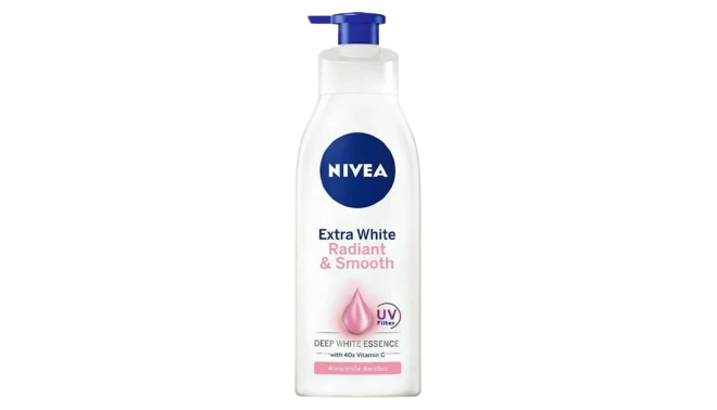 Description: NIVEA Extra White Radiant & Smooth Body Lotion is a lightweight, fast-absorbing lotion enriched with Deep White Essence (concentrated whitening extracts), 40x higher Vitamin C (from Camu Camu and other natural sources), and UV filters for broad-spectrum protection. It deeply repairs, nourishes, and moisturizes the skin from within, promoting visibly fairer, more radiant, even-toned, and smoother skin. The formula fights dullness and damage caused by UV rays while providing long-lasting hydration (up to 48 hours). Dermatologically tested and suitable for daily use on all skin types.