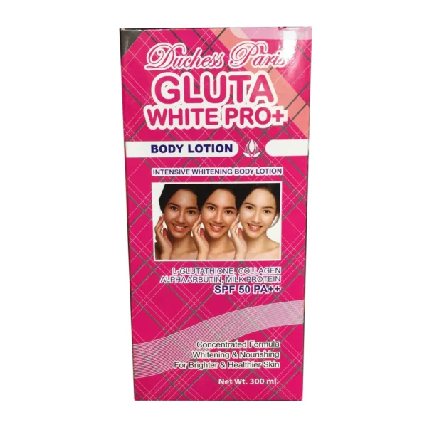 SK Duchess White Gluta White Pro Body Lotion is an advanced skin-brightening lotion formulated with Glutathione, Vitamin B3 (Niacinamide), and Collagen to lighten, moisturize, and improve skin elasticity for a visibly brighter and smoother complexion.